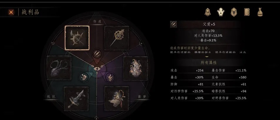 战利品的强化与重铸是提升属性的关键步骤。强化消耗骨粒、珊瑚骨等材料,建议优先升级核心装备如陨日梅瓶或父爱。重铸可调整附加属性,伤痕类推荐优先选择攻击力或暴击率,抵抗类则侧重生命值与防御力。需注意部分战利品如圣纹胸针虽属性全面,但词条效果会反噬自身生命值,需谨慎搭配使用。