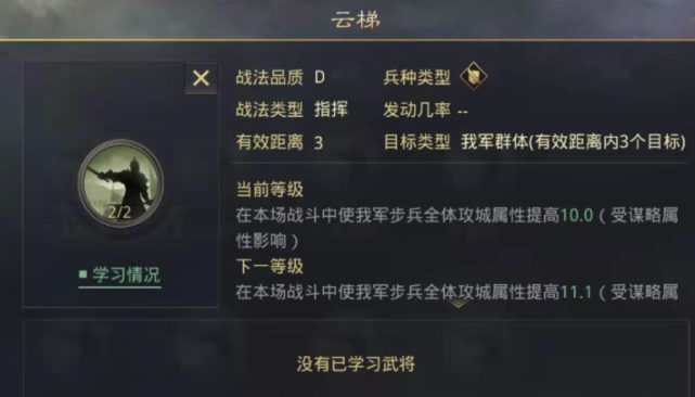 攻城队的核心作用是快速削减敌方城池耐久度,其配置需优先选择步兵武将。步兵的攻城成长值普遍高于骑兵和弓兵,三星及以上步兵如祢衡、潘璋、乐进等因其高攻城属性成为首选。队伍需配备云梯或毁墙战法(仅能携带一种),其余武将学习冲车。20级左右的武将配合满级云梯可使单队攻城值突破200,这是高效拆城的基础。武将加点需全加速度以确保行军效率,谋略最高者携带云梯以提升加成效果。