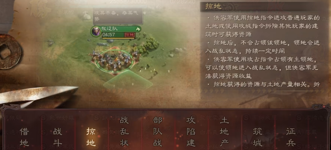 侠客军的玩法和正规军完全不同,最大的特点就是以战养战。侠客军无法通过占领土地获得资源产量,也不能屯田或建造资源建筑,唯一获取资源的方式就是战斗。无论是击败其他玩家的部队,还是攻占他们的建筑、主城,都能掠夺大量资源。不过侠客军之间不能互相攻击,只能打正规军或者其他非侠客军玩家。侠客军的土地上限是60块,但这些土地不会产出任何资源,只能作为连地或战略据点使用。