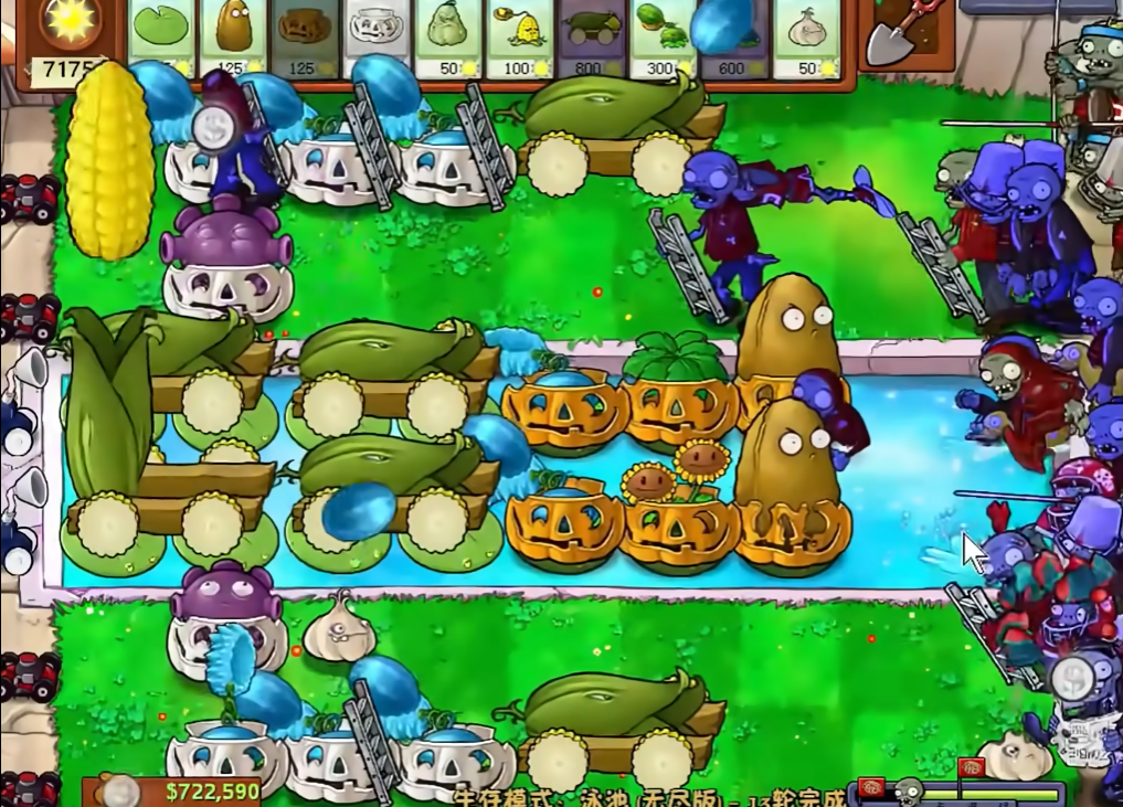建议在泳池后四排放置双头向日葵,陆地每行至少种两排向日葵。水路前三排可先放忧郁菇过渡,阳光充足后替换为玉米加农炮。陆地最前排预留地刺位,中间区域用冰西瓜减速。南瓜头必须及时给关键植物套上,特别是忧郁菇和冰西瓜。