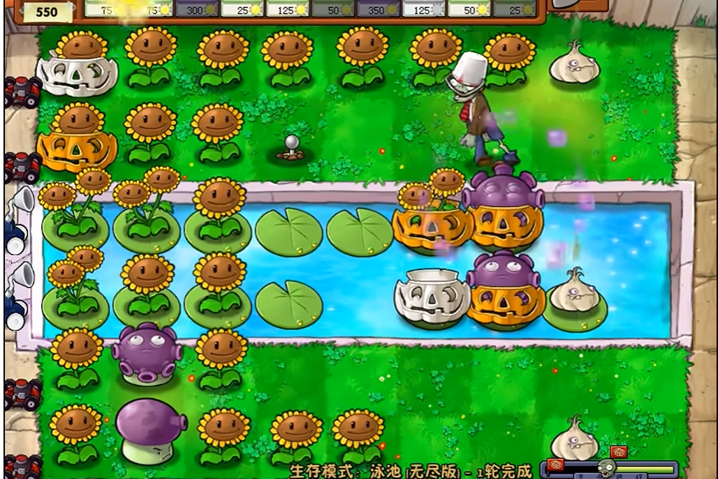 忧郁菇的另一个妙用是防守矿工僵尸和小鬼僵尸,放在场地最后排能完美保护后方。梯子僵尸经过忧郁菇时会放下梯子,咱们可以利用这点在南瓜头上制造无伤防御。忧郁菇和西瓜投手、豌豆射手加火炬树桩的组合堪称终极武器,玉米加农炮不算在内。在生存模式谁笑到最后这类关卡中,忧郁菇阵型最省心。