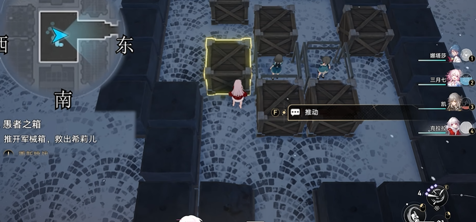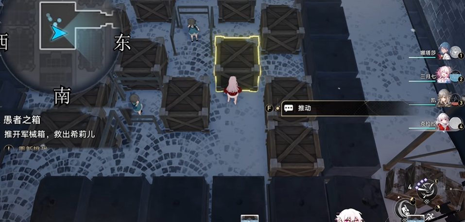 第一次推箱子解谜需要按照特定顺序移动箱子。首先将2号箱右移一格,随后将1号箱右移一格到位。接着将2号箱下移一格到位,再将4号箱左移一格并上移一格到位。最后将3号箱左移一格到位,完成第一次解谜。这个过程中需要注意箱子的移动路径,避免阻塞关键通道。