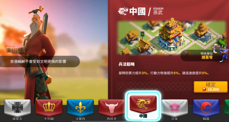 建筑风格的选择直接影响游戏前中后期的战略发展,共有11种风格可供选择:罗马、德意志、不列颠、法兰西、西班牙、中国、日本、韩国、阿拉伯、奥斯曼和拜占庭。每种风格都提供独特的属性加成和特色兵种,玩家需要根据自身发展路线和兵种偏好做出合理选择。步兵玩家通常优先考虑罗马或法兰西风格,罗马提供步兵防御和行军速度加成,法兰西则强化生命值和治疗效率,这两种风格都能显著提升步兵部队的战场表现。
