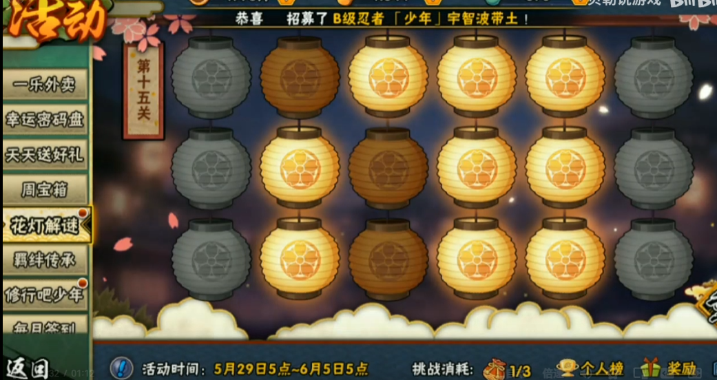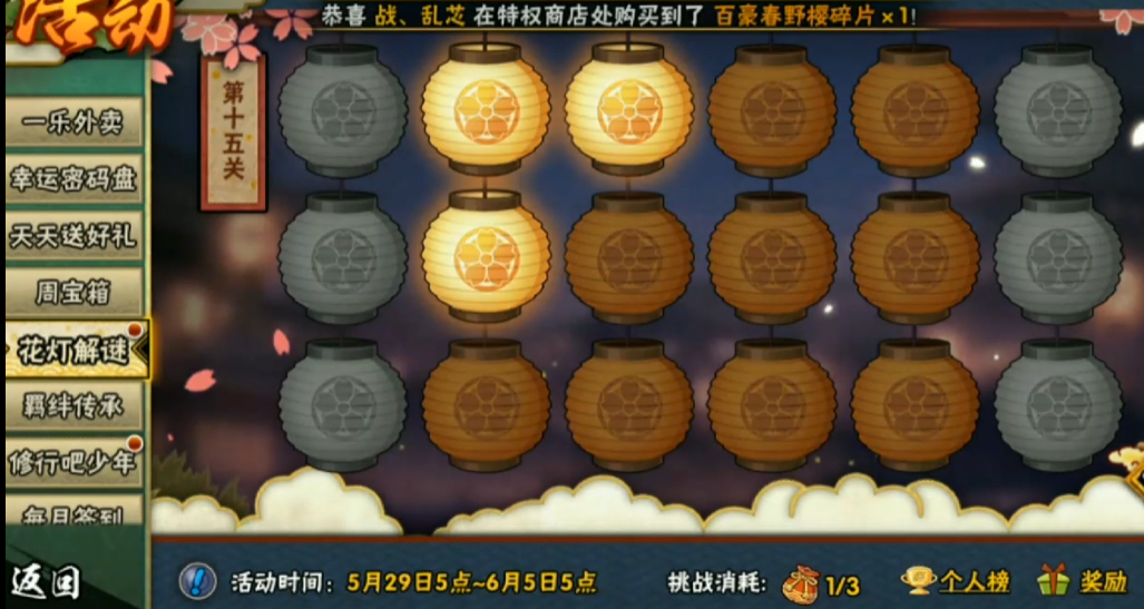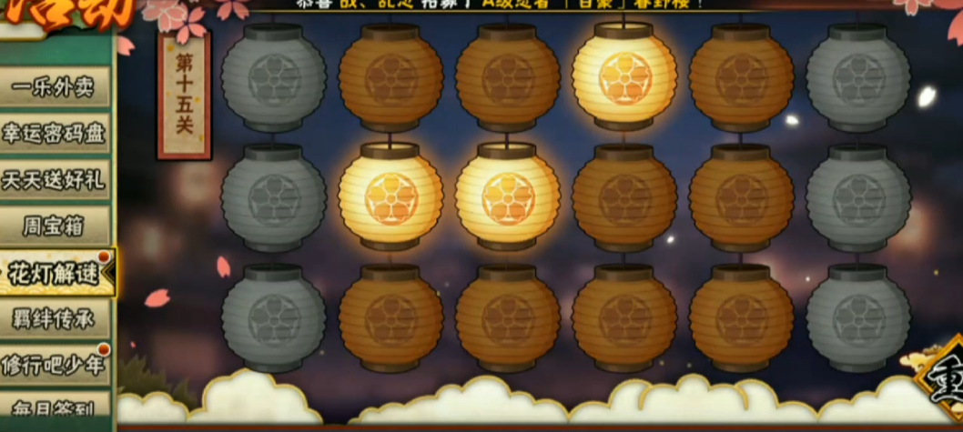 火影忍者花灯解谜第十五关的关键通关方法是:重置花灯后,按照顺时针方向依次点击外围花灯一圈即可完成点亮。这一关的难点在于花灯布局看似复杂,但实际只需遵循固定顺序操作,避免被中间可点击的花灯干扰思路。