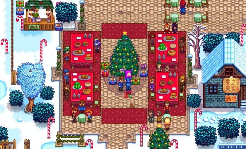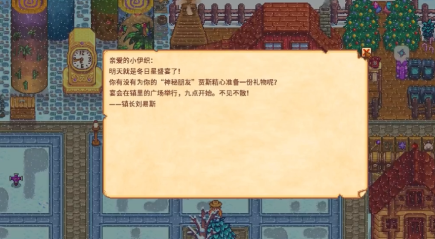 冬日星盛宴是星露谷物语冬季最重要的节日之一,小伙伴们在冬季第25天上午9点到下午2点之间进入小镇就能参加。这个节日的核心玩法是秘密礼物交换,提前一周镇长刘易斯会寄信到农场邮箱,告诉你需要准备礼物送给哪位村民,同时也会有一位随机村民给你准备惊喜礼物。