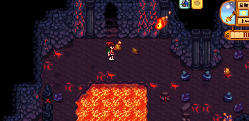 火山位于姜岛最北端,入口处被熔岩河阻挡,需使用喷壶浇水开辟临时路径。建议携带铱制喷壶以提高效率,浇出的路径仅持续当天,次日需重新开辟。通关地牢后可用5个金色核桃建造永久桥梁。火山内部共10层,前9层为随机生成的地牢结构,第5层设有矮人商店,第10层为锻造场。每层入口设有按钮机关,需激活全部开关才能开启通道。