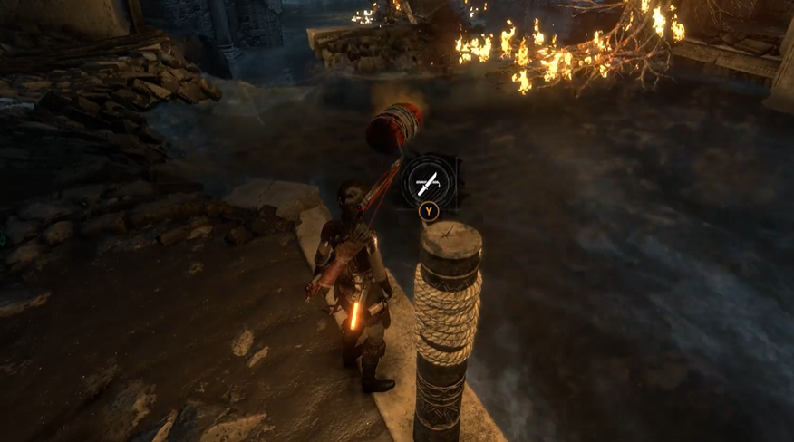当木桶成功运至桥上后,需将其推入水中并漂向雕像。用火箭点燃木桶,爆炸会破坏雕像的支撑结构。另一侧的运送方法类似,但需注意挡路的木板。先用一个木桶炸开障碍,再重复运送和点燃流程。两次爆炸后,关卡通道将开启。过程中需合理利用绳索、弓箭和火箭的配合,确保木桶运输路径畅通。