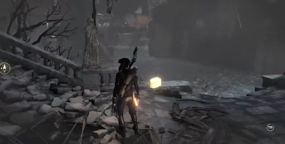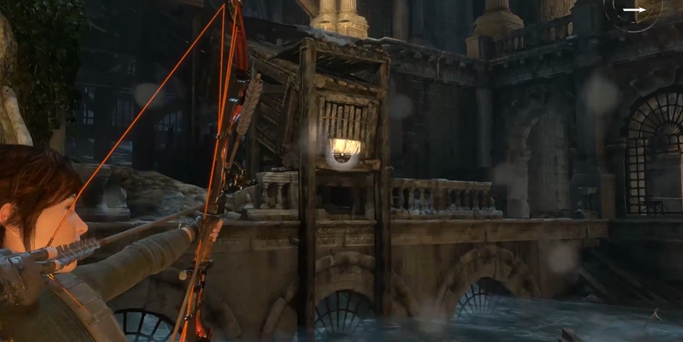 接下来需要游泳到水池对岸,沿着瀑布和水道走会看到一个闸门,用弓箭拉开它放出火罐。第一个罐子会被障碍物挡住,引爆它就能清路。第二个罐子需要用套索箭连接木桩改变漂流路线,等它飘到雕像支座再开枪引爆。这里操作要快,不然罐子就飘走了。