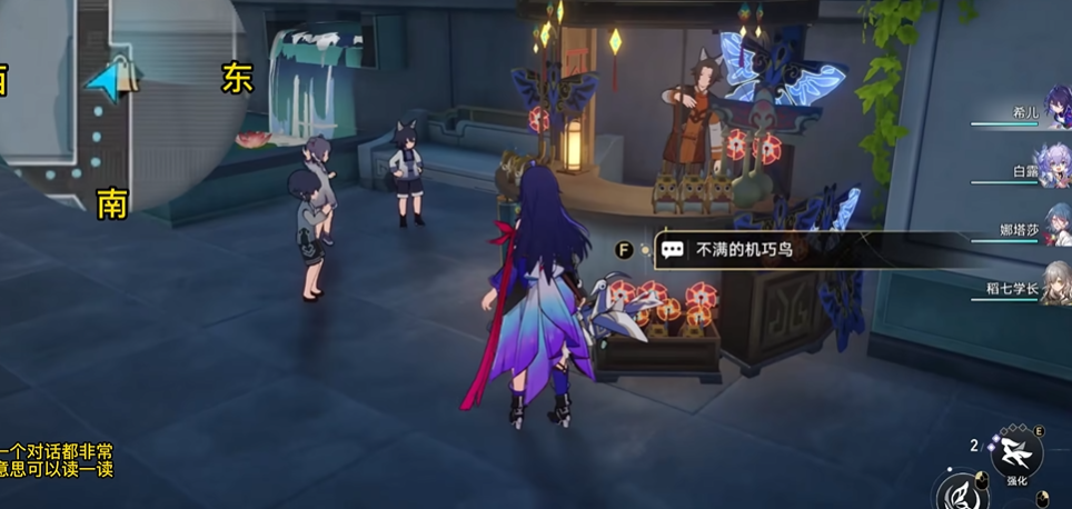 第三只不满的机巧鸟和第四只大壮机巧鸟分别呈现暴食与傲慢特征。前者需要通过特定对话选项驱赶回NPC处,后者则需回答5镝的数值问题。流云渡区域存在两只机巧鸟,自称恶龙的机巧鸟需要完成一个涉及双球转动的机械解密,而绅士机巧鸟则会引导玩家寻找隐藏货箱。
