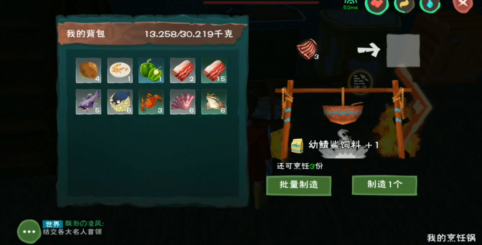 驯服幼鲸鲨的核心在于饲料准备,其配方为优质肉、生羊排和象拔蚌,需至少25包以确保成功率。优质肉可通过击杀剑齿虎、棕熊等生物获取,生羊排需猎杀绵羊,而象拔蚌需使用大闸蟹诱饵(大闸蟹+小麦包)在心悦河垂钓。暴雨天气可能提升刷新概率,但会加大垂钓难度,建议提前储备材料。饲料合成需通过烹饪锅完成,投喂时需确保幼鲸鲨处于眩晕状态。