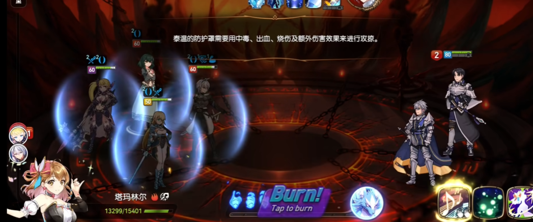 泰温有两个恶心人的护盾,分别在70%和40%血量时触发。这些护盾只能用毒、灼烧、流血或者放狗技能破掉,所以咱们得提前准备好这类手段。毒弓是破盾的好帮手,没有的话就用火系技能或毒系角色替代。第一次护盾出现前,尽量先解决掉水法洛曼,否则他会给泰温加buff,让战斗更难打。破盾后别松懈,泰温在40%血量时会强制召唤小弟,这时候得留好爆发技能快速处理。