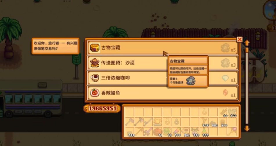 和普通商店不同,沙漠商人可不收金币,只喜欢以物换物。咱们得提前准备好神秘石、海藻纸、骨头或者稀有鱼类这些特殊物品。最实用的要数用10个铱锭换沙漠传送图腾配方,有了它就能随时飞沙漠啦。如果想邀请下水道的科罗布斯当室友,还能用200虚空精华换吊坠当礼物呢。