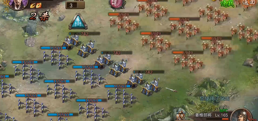 许褚首轮战法后,需手动控制平砍节奏,确保第三排残兵能抵挡敌方第二部将的战法;吕蒙上场后避免立即释放技能,优先利用地形优势平砍至第三排再使用战法;典韦需在接触姜维前保留至少两排兵力,用于抵消姜维的全体攻击。若使用严颜,需确保其最后一排能释放战法封堵姜维技能。整个流程需多次尝试以优化兵力损耗比例。