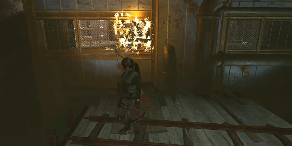 烧掉障碍后,跳到对面的长平台,从左边爬上去会发现一个隐藏的拉绳机关。拉动它可以把卡住的小矿车放出来,这时候再回到长平台,用绳索箭把矿车和附近的绳柱连接起来。这一步很关键,因为只有矿车被固定住,才能用它来挡住水流。