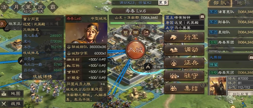 攻占郡城后,太守可在该城池界面编辑军团,将同盟成员集结的部队整合为统一作战单位。一个军团最多包含5支部队,这些部队可来自不同玩家,但需遵循营帐等级限制(例如2级营帐仅支持2支部队)。军团行动时,移动速度和体力消耗均以队伍中最慢的成员为准,这要求成员在集结时需考虑兵种和战法的协调性。军团指令包括行军、攻占、驻守等,但部队处于免战或俘虏状态时无法参与集结。