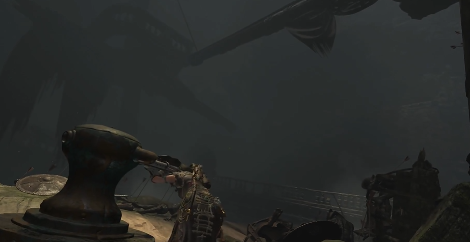 回到船上后,重点来了!你会发现第二处被绳索固定的桅杆。先爬到高处岩石平台,用弓箭射断拴住桅杆的绳子,让它能自由转动。接着荡回桅杆,但别急着爬——还需要调整角度。落地重新转动机关,让桅杆与甲板上的木箱对齐,这样就能借助箱子跳上桅杆顶端,最终触发隼炮砸落。