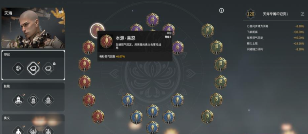 技能搭配方面推荐选择金钟罩·振刀和金刚伏魔·治愈。振刀能有效反制敌人的霸体攻击,尤其在混战中打断对手节奏;治愈则能提升续航能力,变身后通过踩地回血增加容错率。天赋印记建议优先选怒气回复和初始怒气,确保大招能频繁使用。武器选择阔刀或长枪配合远程消耗,避免贴身战被集火。