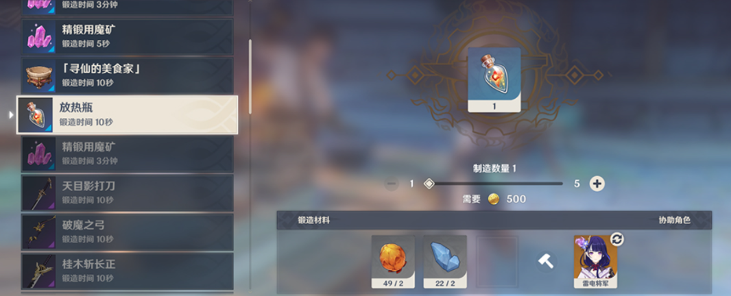准备好材料后,前往蒙德或璃月的铁匠铺。蒙德的瓦格纳在城门口附近,璃月的老章则在船厂旁边。与他们对话选择委托锻造,在小道具分类中找到取暖瓶,放入材料就能开始制作。每次锻造需要一定时间,建议一次性多做一些备用,因为每个取暖瓶只能使用一次。它会在小范围内产生热量,站在这个区域内能快速降低严寒值。在探索没有热源的危险区域时特别有用,比如解谜或战斗过程中。建议随身携带多个,配合其他御寒手段如篝火和深赤之石,能大大提高在雪山的生存能力。