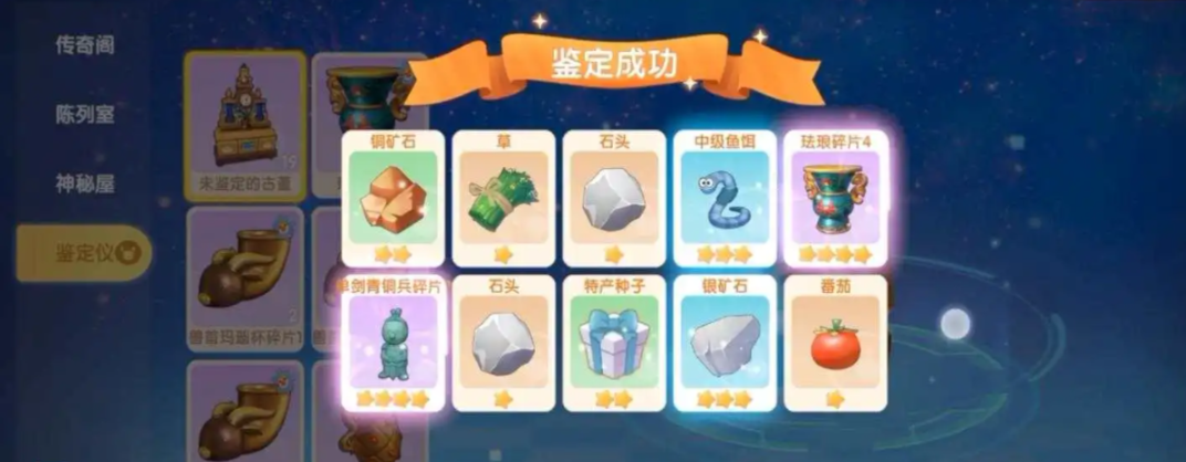 鉴定完成后,古董会变成各种碎片或者完整道具,比如装饰品、肥料、渔网等。这些碎片可以攒起来,等集齐一定数量后,能在神秘商店兑换更稀有的家具或装扮。不同古董鉴定出的东西是随机的,所以多收集一些未鉴定的古董,说不定能开出惊喜。如果运气好,还能碰到稀有古董,比如青铜器或者玉雕,这些摆在家里能提升庄园的繁荣度,看起来也特别有排面。