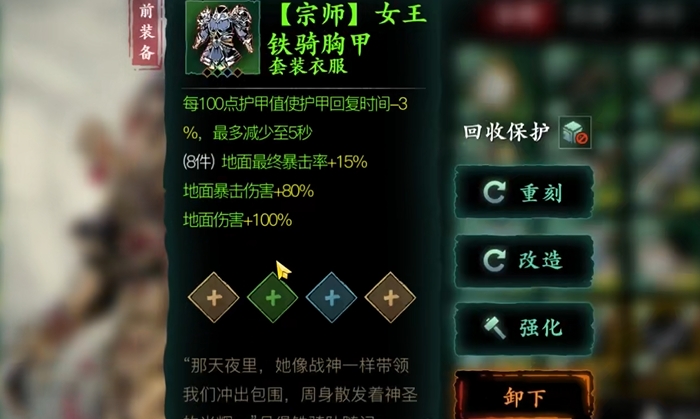 装备属性强化需围绕弦者的职业特性展开。攻击力、暴击率和破甲是首要堆叠属性,后期可补充真伤加成以应对高护甲敌人。女王套2件提供防御与护甲加成,适合生存压力较大的场景;铁君子2件则强化破甲与伤害,适合追求极致输出的玩家。护腕部位建议选择充能护腕以增加杀意点,或搭配白山恨歌护腕激活套装效果。