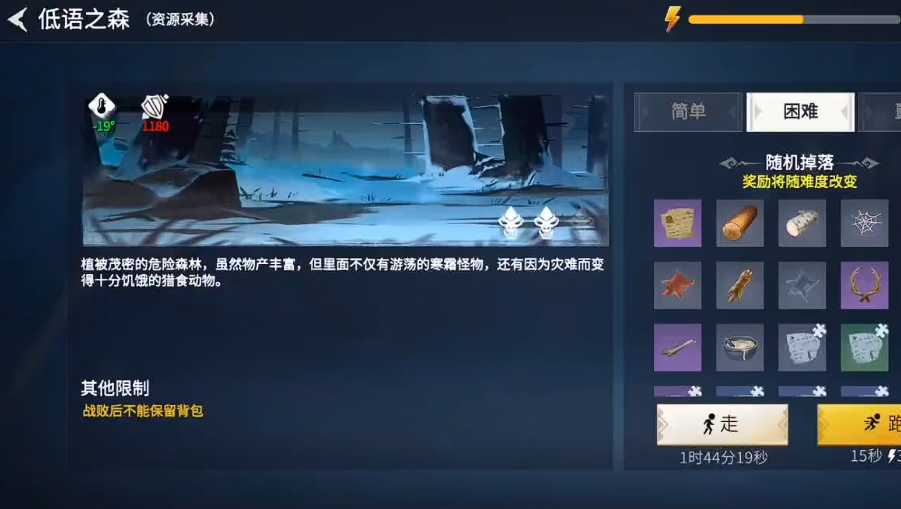 资源收集是打这张图的主要目的之一,困难难度的铁杉木掉落量会比普通模式多。采集时开启自动采集挂机是可以的,但前期建议手动清完怪再挂机。铁杉木和白桦木都是中后期重要的建设与制作材料,需要大量囤积。地图里也会刷新石英石、花岗岩、铁废料和捕鸟蛛网等资源。第一次挑战困难模式,带上你的龙伙伴会安全很多,龙能提供可观的输出和一定的牵制作用。装备耐久在困难副本里磨损会比较快,尤其是护甲,只要被攻击到就会消耗耐久。出发前最好多准备一两把备用武器和一套备用防具。