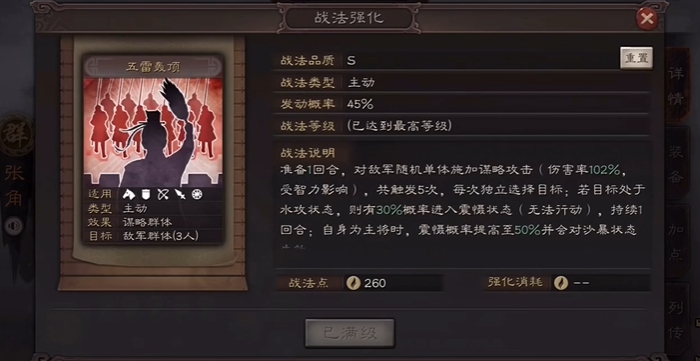 接下来说说他们具体的战法该怎么带。对于主输出张角,最经典也最强势的战法搭配就是太平道法加上士别三日。太平道法能提高主动战法的发动几率,还能增加奇谋也就是暴击的几率,这对需要准备战法的张角提升巨大。士别三日则在前期提供规避保命,后期提供稳定的谋略伤害补充。于吉作为副将和状态提供者,通常带一些辅助或防御型战法,比如锋矢阵可以进一步强化主将张角的输出,或者带抚辑军民、暂避其锋这类减伤战法来保护全队。左慈则一般携带治疗战法如刮骨疗毒和辅助战法如藤甲兵或草船借箭,具体要看对战环境,比如怕火攻就别带藤甲。