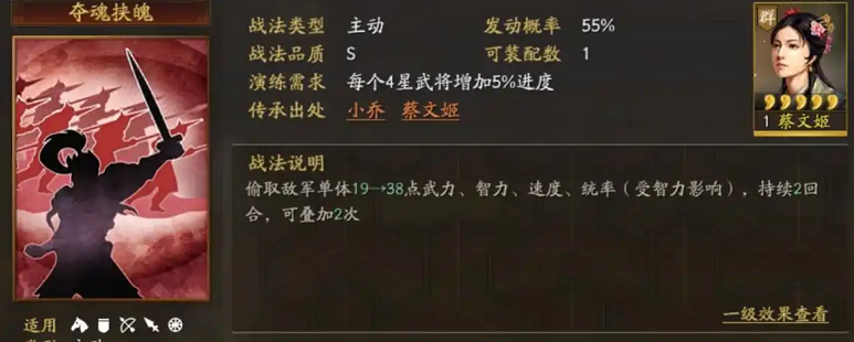 贾诩优先携带夺魂挟魄和伪书相间,前者削弱对手属性,后者则利用混乱进行追加打击。如果没有伪书相间,可以选择兵无常势或杯蛇鬼车作为替代。左慈的核心战法三势阵是必备的,能显著提升贾诩的自带战法概率,象兵则延缓伤害,提升整体续航。