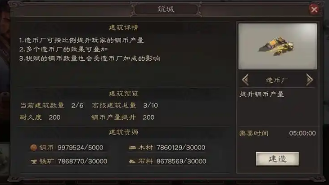 就是你的主城和分城自身产出的。这里面有几个关键点你得抓紧。首先是征税,每天点开政厅,你都能免费征收一次铜币,这可是白给的,千万别忘了。如果你觉得铜币实在紧张,还可以消耗金铢再强制征收几次,能解燃眉之急。其次是城里的民居建筑,它的等级直接决定了你每小时能躺赚多少铜币,所以资源允许的情况下,尽量优先把民居的等级拉高。当你的君王殿升到一定级别,还会解锁造币厂这个高级建筑,它能大幅提升你的铜币产量。建议你先把造币厂升到四级,等每小时产量比较可观了,再考虑往上升级,这样资源分配更合理。别忘了在委任界面,安排政治属性高的武将去当税务官,他的属性高低也能给你带来额外的产量加成。
