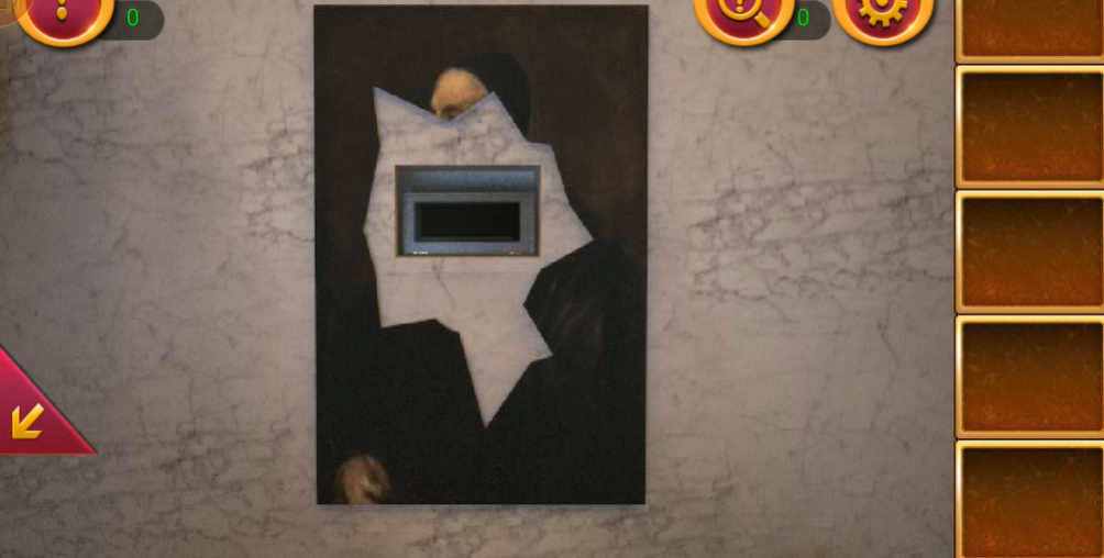 取得纸条后,需要处理楼梯中间区域的那幅普通画像。使用之前获得的小刀将这幅画像割开,会发现画像后面隐藏着一个带有图形旋钮的密码盒。要开启这个密码盒,必须将纸条上算出的数字结果8239与先前在二楼左侧拼图上看到的图形提示进行对应。根据左侧拼图所展示的符号规律,将数字依次转化为特定的图形组合,例如菱形、三角形等,并在密码盒的图形锁上做出相应的旋转调整。当所有图形位置匹配正确后,密码盒会弹出一把钥匙,这把钥匙正是打开本关出口大门的关键道具。