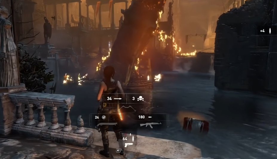 你会经过一段燃烧的水道,此时必须连续加速潜泳以通过危险区域,并注意避开可能爆炸的油桶。成功穿过该区域后,可以在一个换气点找到一具敌人尸体,从中获得无限潜水呼吸器,这件装备将极大扩展你在水下的行动能力。你便正式进入被淹没的档案室的主区域,开始着手解决雕像支座的爆破谜题。