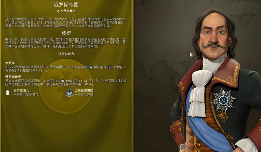 如果你更喜欢稳扎稳打、侧重发展的玩法,俄罗斯和中国会是很好的选择。俄罗斯开局就能圈到大量土地,资源丰富,容错率高,其圣地的建造速度优势也让宗教发展变得轻松。中国则是一个全能型选手,发展均衡,特色能力可以加速奇观建设,长城的改良设施能提供不错的防御和文化产出,让你在科技和文化胜利路线上都玩得很舒服。