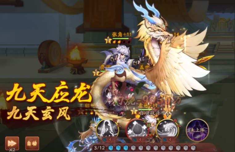 九天应龙的技能机制设计得非常具有层次感,其效果会星级的提升产生质变,养成深度很高。在0至2星的初级阶段,它主要提供针对前排的治疗和概率性的后排回怒。当提升至3星后,后排回怒变为必定触发,并开始为全队提供伤害加成与减免,同时为己方生命最低的一名武将附加疾风状态。达到5星以上时,增益范围进一步扩大,能为两名武将附加疾风状态,并额外提升全队的防御力。满星状态下,其技能效果达到顶峰,能够为生命最低的三名武将提供疾风状态,并使全体攻击、防御、伤害加成与减免均获得大幅提升,这种全方位的属性强化能瞬间拉高整个队伍的战力上限。
