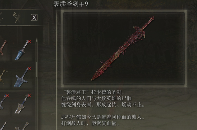 若选择力敏均衡的路线,武器的选择将更为多样,其中不乏兼具优秀面板与决定性战技的传奇武器。亵渎圣剑是突出的选择,它虽不完全依赖单一属性,但其自带的火属性伤害与战技掠夺火焰的吸血效果,在各类战斗中均有稳定且强大的表现。猎犬长牙作为前中后期均可靠的曲剑,其战技猎犬剑技兼具位移、伤害与出血积累,是力敏流派的高效武器。玛莲妮亚的义手刀、黑刀等以灵巧为主的武器,在敏捷属性达标后也能为流浪骑士所用,它们以快速的连段和华丽战技著称,适合追求灵活战斗节奏的玩家。