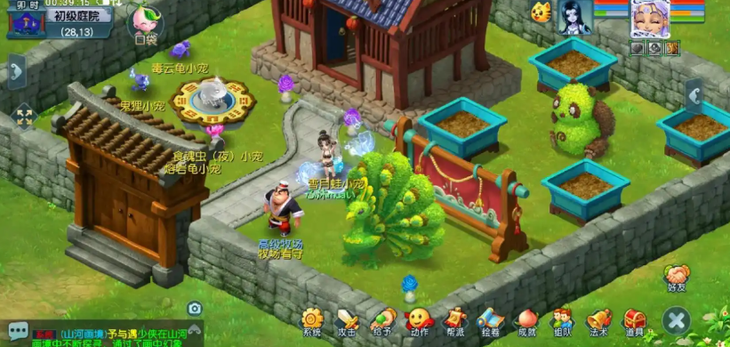 庭院系统则延伸了家的概念,它最初随房屋赠送,玩家可以将其从初级扩建至高级以获得更大空间。庭院的实用价值显著,玩家可以在庭院中布置花盆与花圃来种植各类植物种子,通过每日浇水、施肥、除虫的简单照料,植物在顺利成长后结出的果实能够开出经验、梦幻币乃至宝石、魔兽要诀等意外奖励,形成稳定的额外收入来源。庭院也是建设牧场的基础,为养殖玩法提供了场所。