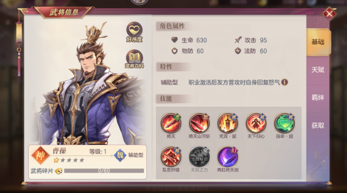 曹丕在游戏中是个非常全面的辅助型武将,他的核心优势在于减伤和怒气循环能力。羁绊效果能让队伍受到的最终伤害大幅降低,敌方每有一个减益状态,我方受到的伤害就会减少,最多能降低24%。这意味着只要合理搭配队友,队伍的整体生存能力会显著提升。曹丕的技能还能驱散敌方增益效果,配合特定武将时效果更佳。