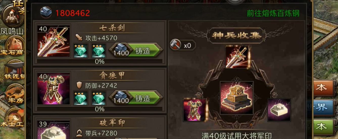 攻击型晶石建议选择十阶斩杀和十阶乱舞,防御晶石需达到十五级以上,血量晶石建议双二十四级。兵器等级最好全达到40级级,套装推荐使用真灵龟、真凤凰、真驱虎和真烛龙等高级套装。这些配置能有效提升武将的生存能力和输出效率,弥补兵力消耗带来的劣势。