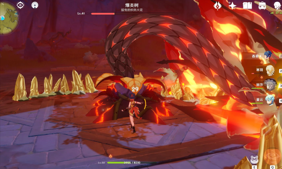 爆炎树作为火元素BOSS,用香菱打它其实挺有意思的,虽然她也是火属性角色,但合理搭配技能和队友就能轻松搞定。首先咱们得知道爆炎树的弱点机制,它有两个发光核心,一个在根部,一个在头部。打的时候优先用水属性角色破盾,比如芭芭拉或者行秋,破盾后香菱就能上场输出了。香菱的锅巴和大招都能持续挂火,配合水属性队友打蒸发反应,伤害会非常可观。