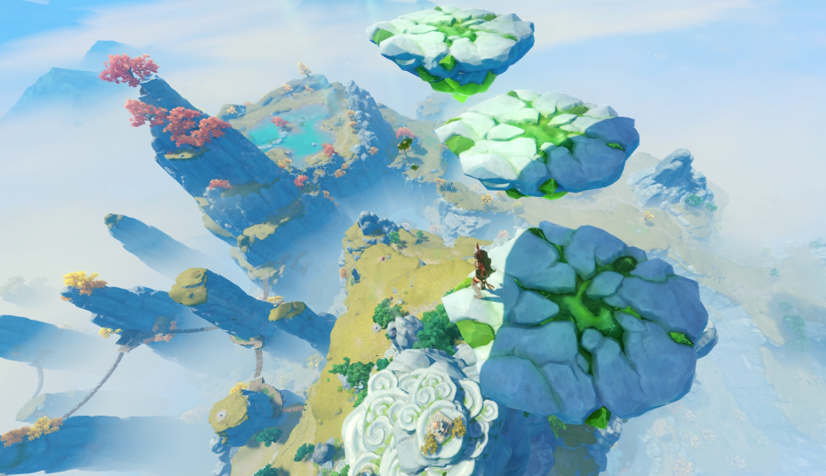 借助上升气流飞至空中后,会出现由风场托起的台阶。第一次上升时会遇到三个台阶,前方会再次生成新的气流。继续利用风场攀升,第二次出现的台阶高度较高,需注意调整飞行角度,避免跌落。成功抵达第二段台阶后,攀爬即可到达空中庭院平台。此处是璃月地区的最高点之一,视野开阔,可俯瞰整个提瓦特大陆的壮丽景色。