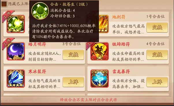 除了控制型合击,功能性技能也很重要。救苍生符是全体治疗加驱散异常状态的强力辅助技能,适合在持久战中保持队伍生存能力。憾天符则是单体收割型技能,能对残血目标造成致命伤害并降低其防御,配合高爆发武将可以快速减员敌人。如果阵容缺乏后排输出,悍勇符是不错的选择,它能对后排造成伤害并提升前排格挡率,增强整体攻防平衡。
