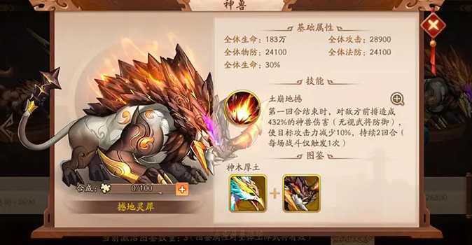 神兽分为不同品质,紫金、金色和红色神兽效果差异较大。金色神兽如神木青鸾和撼地灵犀,技能效果非常强力,前者能提供群体治疗和无敌效果,后者则擅长控制和爆发伤害。紫金神兽如天禄貔貅更全面,不仅能回血还能附加护盾和增益。建议优先培养高品质神兽,低品质的可以暂时用来激活图鉴属性。
