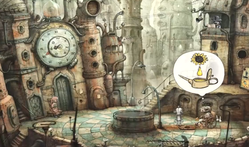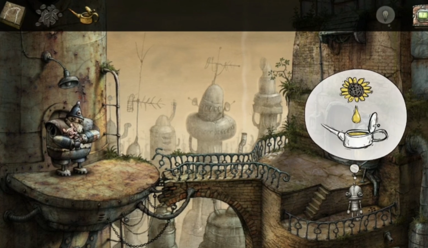 葵花油是第八关的核心道具,拿不到它就没法推进剧情。进入关卡后会看到一个复杂的机械装置,主角站在中间,周围全是各种机关。这时候别急着乱点,先观察场景结构,记住葵花油这个关卡名称就是重要提示。第一步让主角向左移动,上方楼梯会升起,这时能看到一个黄色方形按钮,按下去会在两个蓝色方块间打开通道。穿过通道后继续操作蓝色按钮关闭门并升起新楼梯,最后按下红色开关启动大钟装置——这个旋转的大钟指针是整关最关键的机关。