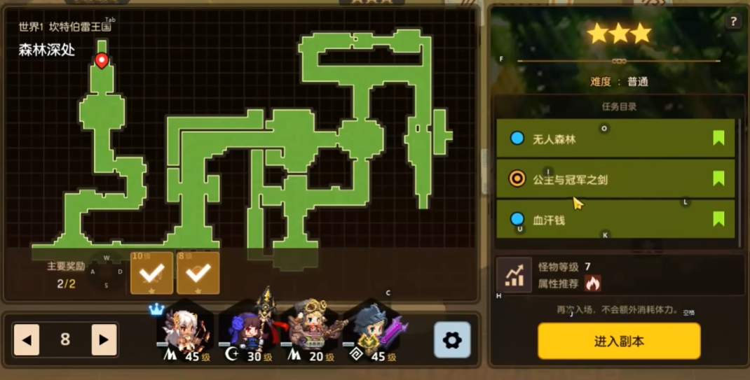 1-7冠军之剑关卡存在两种解法:跟随白色手帕标记或输入密码上上下下左右左右开启地图。隐藏支线懒惰的妖精需在世界2、3、5各找到一本书,最终奖励角色和魔卡。祭坛交互需完成对应任务链,例如森林边境任务要求20秒内通过障碍通道,古代遗迹入口任务需与铁匠NPC对话获取钥匙。