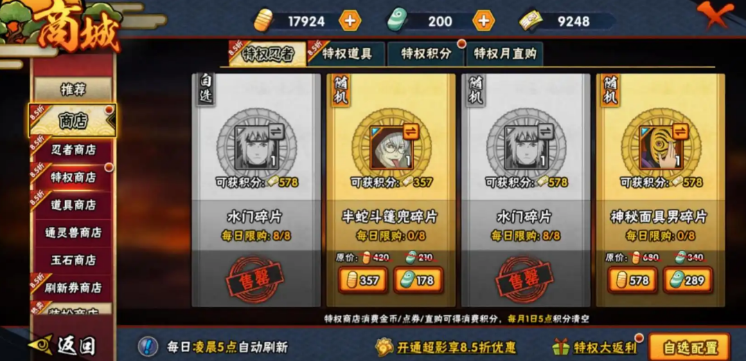 火影忍者v0玩家获取须佐鼬的核心策略在于合理规划金币与碎片积累。作为零氪玩家,首要任务是集中资源参与高级招募活动,每次新S忍上架时投入首付抽奖(通常100抽),利用附带的A忍碎片机制间接获取须佐鼬碎片。同时须关注特权商店随机刷新的碎片,单价520金币,需长期蹲守购买。须佐鼬作为特殊形态忍者,其碎片还可能通过限时活动兑换或忍者许愿宝库返场时抽取,但需提前储备至少3万金币以备保底需求。