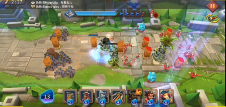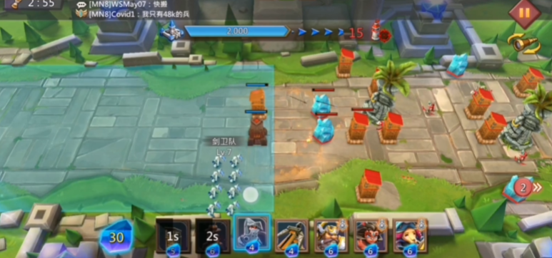 开局需在前沿快速部署防御塔作为屏障,随后在塔后放置炮车形成火力网,配合旋风技能削减敌方防御塔血量。面对敌方英雄出现时,及时释放图腾进行牵制,并补充肉盾英雄保护后排输出单位。本关的关键卡牌包括小魔像、小炮车等过渡性单位,在未获得高级卡牌前可作为有效替代。