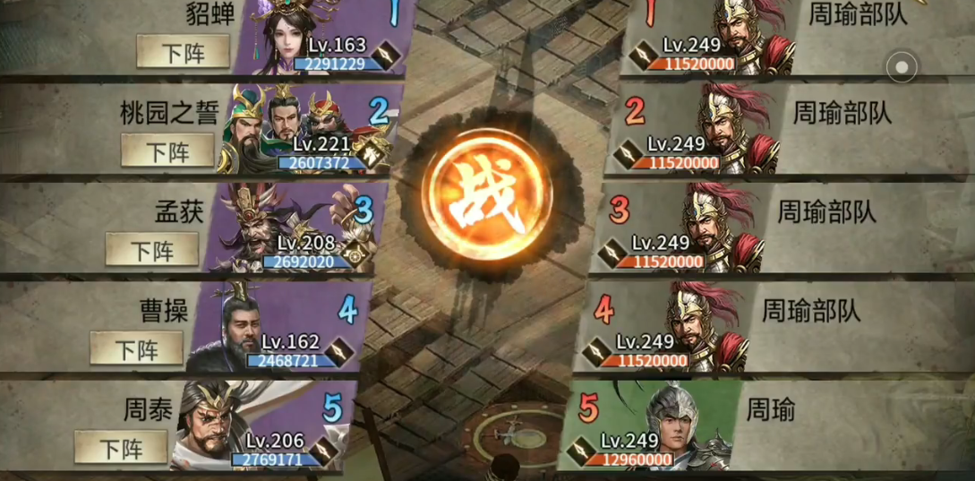 实战中需注意NPC特性:敌方五将均携带四车,战法可伤五排且平砍强度较高。马超起手自动战法需精准封住第一个NPC技能,若未能命中可手动补刀。桃园之誓需保持龙腾状态持续输出,必要时切换手动操作调整战术。孟获与陆逊组合需依靠云垂阵的群体增益效果,曹操则利用三车抗伤并为夏侯渊创造战法释放空间。周泰作为收尾武将,需确保方圆阵和克制书生效以应对残局。