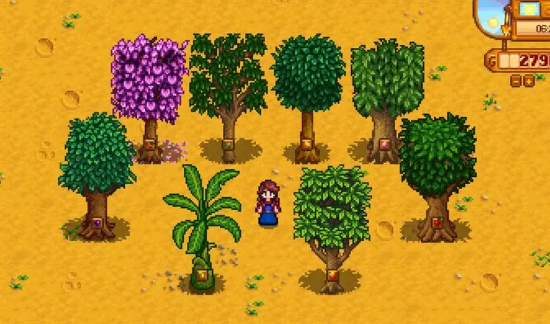 果树是另一种高价值选择,包括樱桃树、杏树、橙树、桃树和苹果树。果树需要28天成熟,之后在特定季节结果。果实的直接售价较高,也可加工成果酱或酒类进一步提升利润。果树种植需确保周围8格空地,否则无法正常生长。温室或姜岛种植的果树不受季节限制,可全年收获。芒果和香蕉树是后期解锁的特殊果树,需通过姜岛商人获取种子。