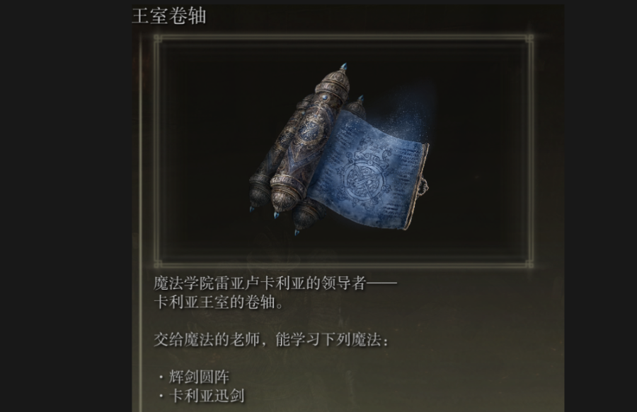 魔法卷轴是学习新法术的关键道具,例如王室卷轴、学院卷轴和教室卷轴。王室卷轴位于宁姆格福的亚基尔湖南方东侧悬崖废墟,学院卷轴则在魔法学院雷亚卢卡利亚内部。将这些卷轴交给结缘教堂的大乌龟或瑟濂后,即可购买对应法术。部分法术如陨石术需通过探索盖利德的贤者镇废墟直接获取,无需交付卷轴,但需满足智力属性要求。