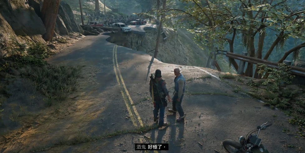 从农舍阳台跳下去后,酒鬼走到了大路上,咱们骑车沿路追,路上还能看到两个酒瓶。最后在公路边找到他时,他已经醉得差点走进暴走潮里,幸好咱们及时赶到劝他离开。这时候得赶紧骑车带他回营地,路上还会被暴走潮追击,记得保持速度别被缠上。