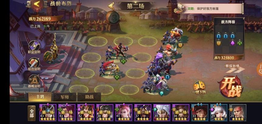 第二场建议使用军师张宝,搭配弓兵孙尚香、甘宁,盾兵黄盖、孟获,重骑吕布及轻骑曹冲,助战仍选赵云。敌方阵容以重骑为主,需利用轻骑绕后切敌方弓手,盾兵则需拖住敌方重骑。弓手孙尚香和甘宁在后排持续输出是制胜关键,注意空路放置轻骑以干扰敌方阵型。军师技能选择上,张宝的群体控制能有效打乱敌方节奏。