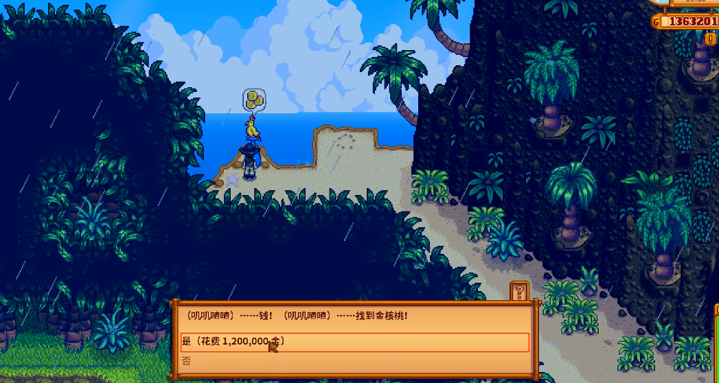 修复断桥的具体操作流程是:首先在姜岛各处收集至少10个金核桃,然后前往断桥附近找到沉睡的乌龟。与乌龟对话后,消耗10个金核桃即可唤醒乌龟并完成断桥修复。金核桃的获取方式多样,包括摇动特定椰子树、挖掘地面闪光点、完成小游戏等,建议玩家在岛上进行全面探索。